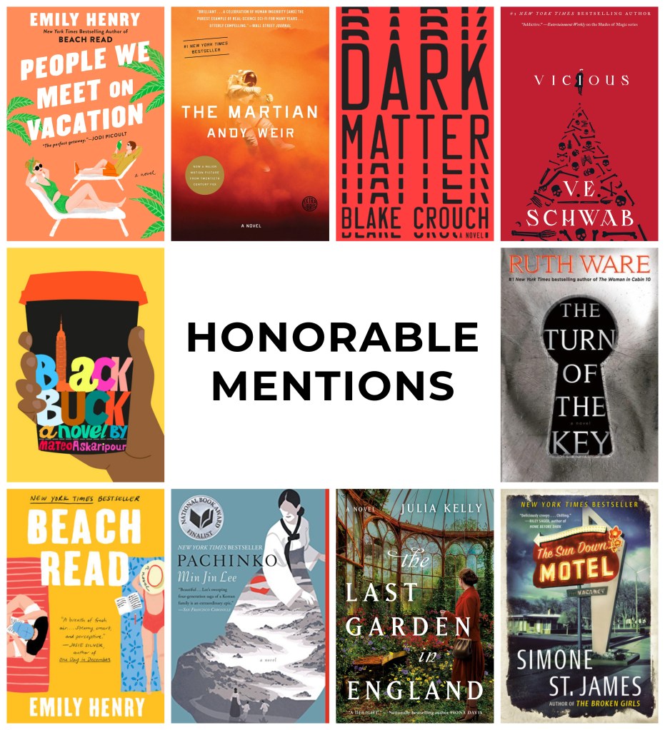 As I look at this list, even I’m surprised by the variety in genres mentioned. Got a little bit of everything from contemporary fiction to historical fiction to memoirs and humor, a science fiction selection, and most surprisingly, only one mystery/thriller on the list this year!